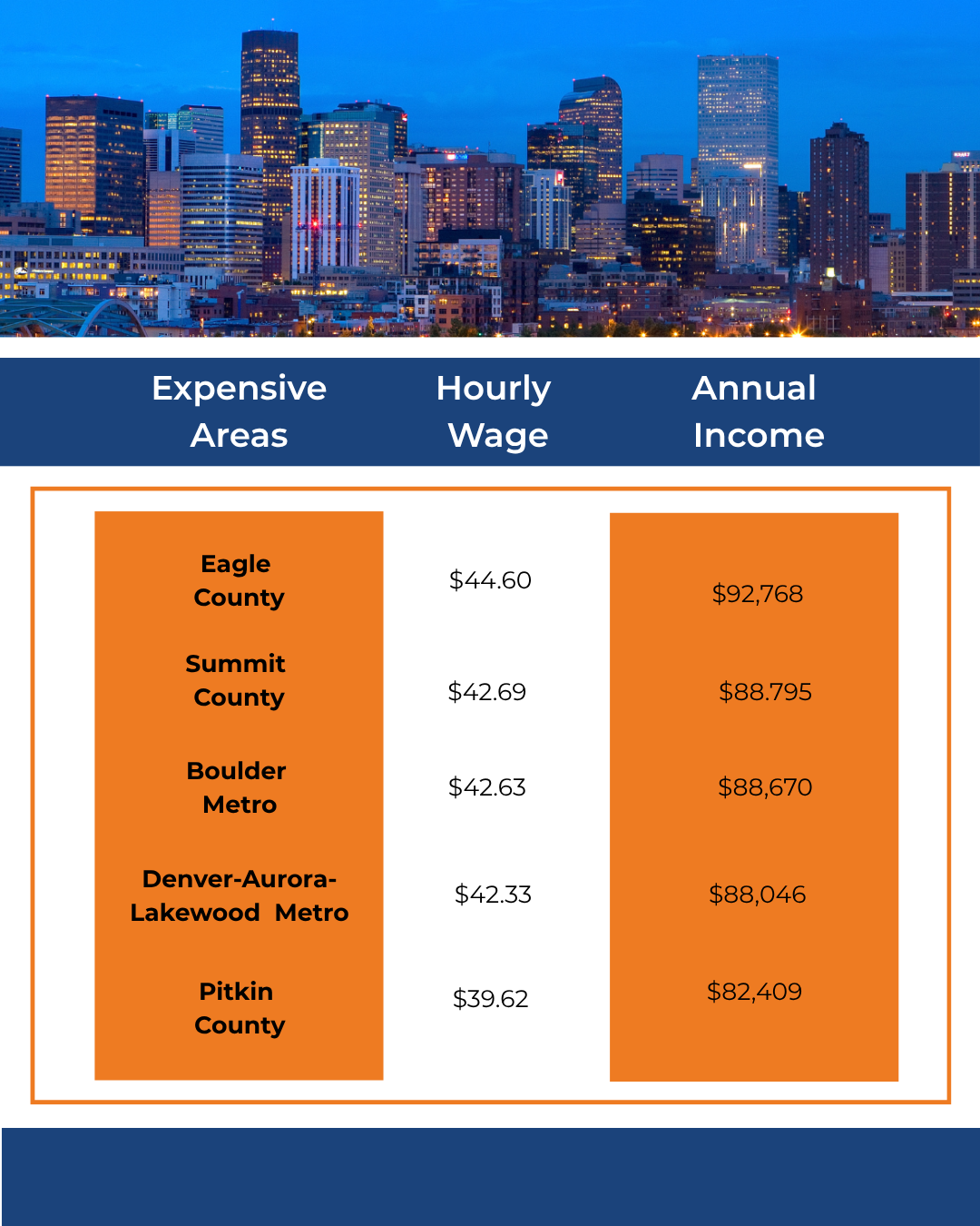 The most expensive areas to rent based on a two-bedroom home average Fair Market Rent (FMR) include Eagle, Summit, and, not surprisingly, Boulder Metro counties. Looking at rent affordability through an hourly wage lens offers more clarity. Would-be renters and current renters considering a move to a more appealing area can compare their rate to the average wage for a better idea of what’s possible. The National Low Income Housing Coalition (NLIHC) provided a 2025 Colorado Housing Profile with housing wages for the most expensive places to rent. The housing wages assume a 40-hour work week and 52 weeks per year.