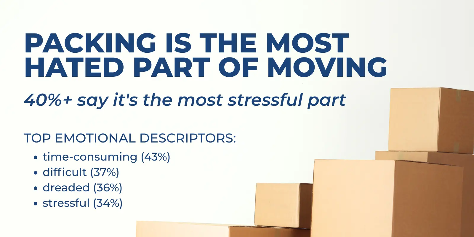 DIY packing or packing-in-place is often the most dreaded part of moving. Almost everyone who has moved at least once likely agrees that packing contributes to its fair share of frustration and stress. Airtasker’s blog, “More than 40% claim packing to be the most stressful part of moving,” called out packing as the most stressful for almost 41% of research respondents. Unpacking wasn’t far behind at nearly 21%.